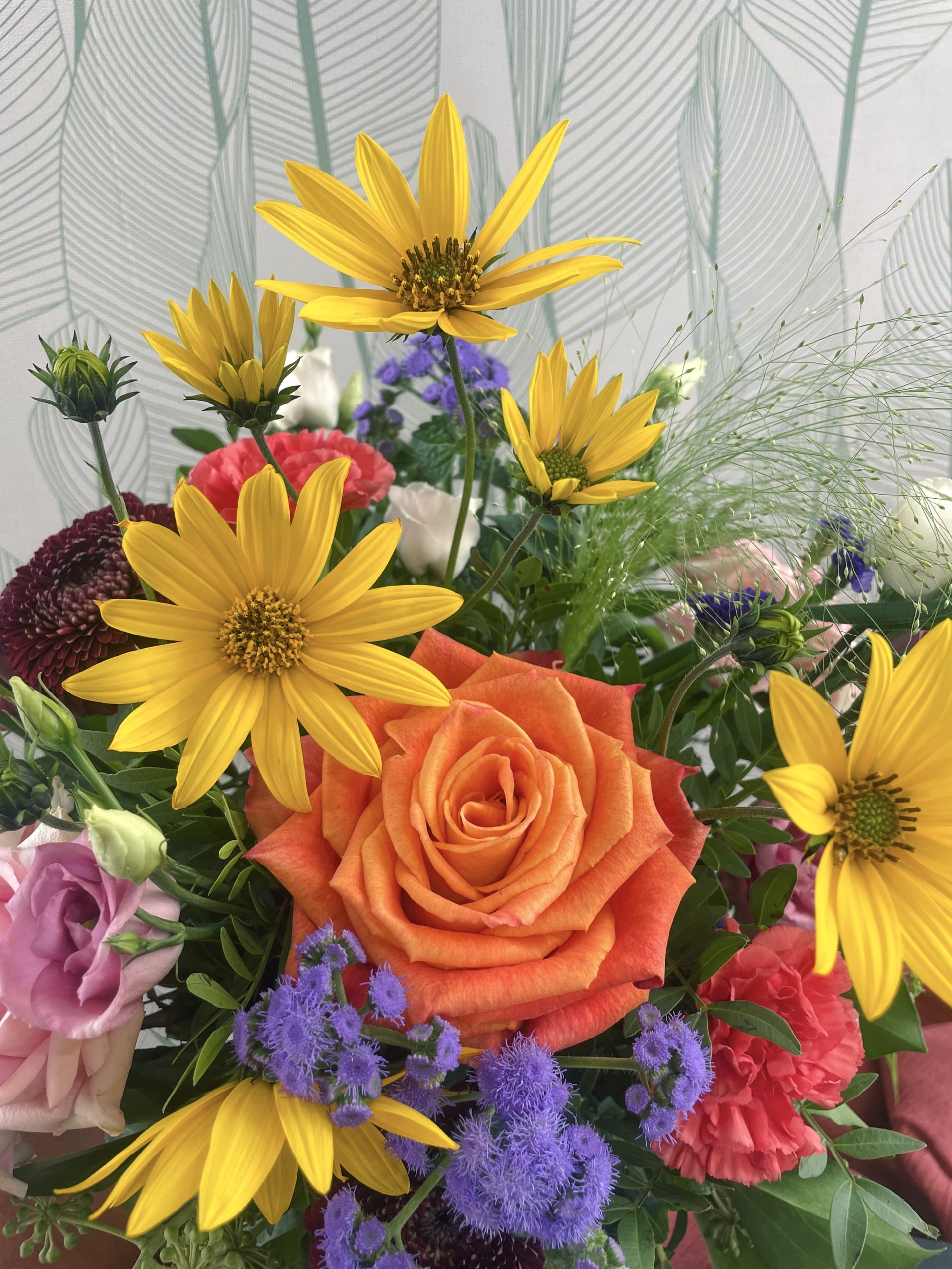 Bouquet champêtre de fleurs fraîches aux couleurs mélangées, composé en fonction de la saison et de notre inspiration, hauteur 40cm. La photographie correspond à la taille M.